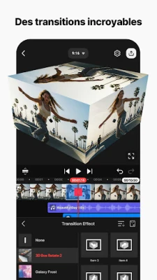 KineMaster est votre toile pour l'expression artistique illimitée. Stimulez votre imagination avec des milliers de modèles prêts à l'emploi, vous permettant de démarrer un projet en quelques clics ou de partager vos propres créations avec la communauté mondiale grâce à la fonction Mix. Sauvegardez vos avancées en toute sécurité avec KineCloud, assurant une continuité de travail fluide entre vos appareils. Enrichissez vos productions grâce à la vaste boutique d'assets de KineMaster, débordant d'effets visuels saisissants, d'autocollants dynamiques, de musiques et SFX libres de droits, de polices stylisées et de filtres colorimétriques pour parfaire chaque scène.