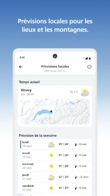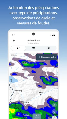 Explorez des prévisions détaillées, allant de l'instantané sur cinq heures pour votre position exacte à un aperçu clair sur huit jours pour toute localité suisse. Visualisez la force du vent et les températures à diverses altitudes, ou consultez les bulletins régionaux enrichis d'une carte isobare européenne et de prévisions routières. Plongez au cœur de l'action grâce aux animations météorologiques dynamiques, montrant les précipitations, le vent, la température et la couverture nuageuse, y compris la possibilité de signaler des chutes de grêle. Des images satellite complètent ce tableau, vous offrant une perspective inégalée sur l'évolution du temps. MeteoSuisse enrichit également votre expérience avec des rapports et clichés d'événements météorologiques partagés par la communauté.