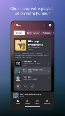 YouTube Music vous ouvre les portes d'un univers musical riche et varié. Explorez des concerts live, remixes et titres exclusifs. Accédez à des milliers de playlists thématiques et découvrez des mix personnalisés pour chaque occasion, de la détente au sport, basés sur vos goûts. Créez et partagez vos playlists.
